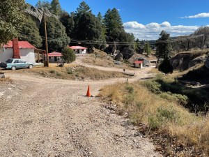 Ich stehe also mit Sack und Pack kaum auf der Strasse in Creel, da hält auch schon ein etwas zerbeulter Pickup und eine junge Frau am Steuer fragt mich ob ich Marco bin. Ich bejahe, steige ein und sie sagt auf spanisch irgendwas von einem Hotel und fährt los. Wir verlassen den kleinen Ort und Anna fährt auf Strassen die keine sind, in ein kleines Tal etwa 5-10km ausserhalb Creel. Sie bleibt einige Male in den riesigen ausgespülten Löchern auf der etwa vier Meter breiten Naturstrasse stecken und kommt oft nur nach mehrmaligen Versuchen wieder raus. Ein Schelm, wer jetzt denkt, ich hätte gedacht: Frau am Steuer etc. etc. Da wäre in einem Rutsch nicht mal ein Chicken-Busfahrer (die Geschichte kommt noch) durchgekommen. Und das sind wahre Steuerakrobaten. Die Mühe lohnt sich. Dieser winzige kleine Taleinschnitt ist allerliebst.