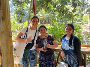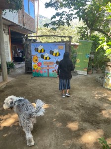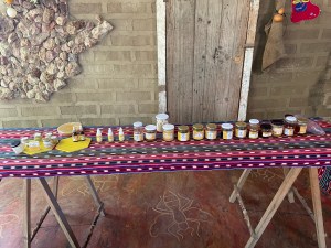 Mina erklärt mir, dass Sie zwei ganz bestimmte Orte hier auf San Juan besuchen will. Nämlich eine Bienenzucht mit Bienen ohne Stachel und eine kulturelle Organisation welche sich um die Erhaltung von sehr alten handwerklichen Techniken bemüht. Ich bin sofort begeistert und erkläre Ihr, mein dringlichstes Bedürfnis sei nur Kaffee trinken und ob ich mich Ihr anschliessen dürfe. Sie lacht und ist einverstanden. Und so trinke ich meinen Kaffee in höchst hübscher Gesellschaft und wir machen uns anschliessend auf den Weg zur Bienenstation. Mina ist 22 Jahre alt, Engländerin aus London, ursprünglich türkischer Abstammung und arbeitet in Panajachel für eine NGO. Diese unterstützt in Panajachel eine Ausbildungsstätte für Jugendliche. Heute ist Ihr freier Tag. Toll denke ich und beglückwünsche mich in das Boot gesprungen zu sein.