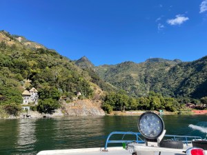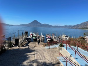 So um Mitternacht in Panajachel angekommen. Das Hotel gefunden. Alle Knochen wieder dort hingetan wo sie hingehören und geschlafen. Am Morgen mein erster Gedanke, runter zur Seepromenade, e Kaffi und e Gipfel und dann mal Panajachel schauen gehen. Typisch Turista halt. Nur, da war keine Seepromenade und da war auch kein Kaffeehaus. Ein schmaler Weg führt zum Ufer und ich finde diesen, weil ich zwei jungen Typen in Shorts und Badelatschen nachlaufe. Also, das sind etwa 10 schmale Bootsstege, überall kleine Boote und (noch) wenige Leute die auch dahin gehen und in die Boote steigen. Die scheinen alle zu wissen wo sie hinwollen. Ich stehe mal raus auf einen dieser Stege und geniesse die Sicht. Alles erinnert mich an den Lago di Lugano. Ähnliche Distanzen zu den gegenüberliegenden Ufern, die Berge ringsum und schön warm. Ja und da steht auch ein alter Bekannter, da steht der Monte Bre.