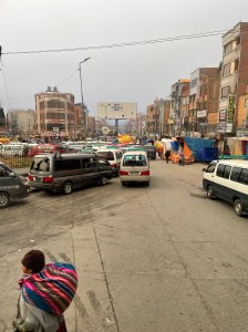 Und wieder müssen wir durch diesen roten Häusergürtel in Alto durchfahren. Die Aussenquartiere beginnen etwa 10 bis 15Km vor der Stadt. Die Häuser links und rechts höchstens zwei oder dreistöckig. Praktisch keines ist fertig gebaut. Meist sind das Erdgeschoss und Teile im ersten Stock fertig. Aber überall leere Fensterhöhlen und Armierungseisen die in den Himmel ragen. Neubauruinen, fällt mir bei diesem Anblick ein. Während Kilometer kein schöner Anblick. Je mehr wir auf Alto zufahren umso grösser wieder das Verkehrsaufkommen, der Lärm und der Gestank nach Diesel und Benzin. Die Strasse ist mittlerweile sehr breit geworden. Sechsspurig und mehr verstopfen unzählige Kleinbusse, Autos, Busse und Menschen die Strasse. Die Kleinbusse haben Nummern von 100 bis 800. Irgendwann habe ich aufgehört zu zählen. Jeder dieser 10 bis 15 Plätzer hat eine Destination und laufend steigen Leute ein und aus. Mitten im Verkehr und mitten auf der Strasse. Wir brauchen wieder über zwei Stunden um dieses Chaos zu durchfahren. Es ist von oben aus dem Bus faszinierend zuzuschauen. Ein Feinverteilernetz auf Bolivianisch. Das System funktioniert…………noch. Alleine dieses funktionierende Durcheinander gesehen zu haben, machen die insgesamt 8-9 Stunden Busfahrt am heutigen Tag erträglich. Ich frage mich einfach, wie lange kann das noch so funktionieren bis das System kollabiert. Immer mehr Menschen, mehr Busse, breitere Strassen……?!?