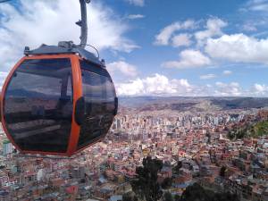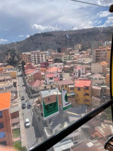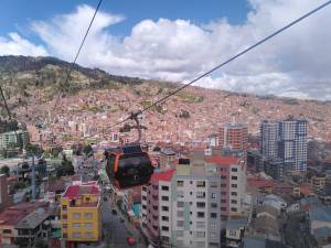Die verschiedenen Routen der Gondelbahn sind nach Farben aufgeteilt. Ich habe mir auf dem Fahrplan eine vermeintlich einfache, durchs Zentrum der Stadt, gezogene Route zusammengestellt. Mit Blau beginne ich. Das geht einigermassen gut. Die Masten sind nicht viel höher als auf einer unserer Skipisten in der Schweiz. Dann steige ich um auf die gelbe Linie. Plötzlich tun sich Gräben links und rechts der Häuser auf. Aus 30-40 Meter Höhe werden plötzlich 100 und 150 Meter. Ein Adrenalinstoss jagt den nächsten. Zum ohnehin starken Gefälle in der Stadt sind immer wieder diese Gesteinsbrüche, welche riesige Schluchten aufmachen. Der Schrecken ist um ein Vielfaches grösser als das Vergnügen. Als mir das Adrenalin aus den Ohren spritzt steige ich aus. Ok, La Paz von oben ist nichts für mich.