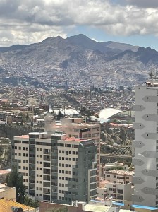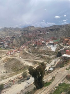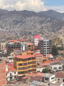 Eine unglaubliche Stadt. So wie Venedig eines Tages im Meer verschwinden wird, so lauten zumindest viele Prognosen, wird eines Tages La Paz im roten Sand und Gestein versinken. Etwa 15 unterirdische Flussläufe unterspülen ständig die Mauern dieser Stadt. Sie ist in einem riesigen Kessel gebaut. Wenn man mit dem Flugzeug ankommt (auf 4200m) fährt man zuerst durch den Stadtteil Alto und dann runter in den Kessel auf 3500 Meter. Oben die Häuser mit rotem Backstein gebaut und an den Hängen und unten viele moderne Hochhäuser.