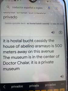 Dem Mann scheint nun doch ein kleines Licht aufgegangen zu sein. Seine Stirn glättet sich und wir fahren los. Über die Brücke auf die Landstrasse, raus aus dem Ort, einen Hügel hinauf. Völlig falsch. Wir fahren zurück auf die Hauptstrasse. Geschafft, da steht das Hotel. Ich gehe rein und frage den Mann hinter dem Tresen. Wieder blicke ich in eine faltige Stirn. Aber immerhin, er nimmt sein Handy und beginnt zu telefonieren. Zwischenzeitlich habe ich den Taxifahrer reingebeten. Ich will sicher sein, dass die Adresse, falls ich den eine erhalte, im Originalton beim Taxifahrer ankommt. Der Hotelmann hält mir sein Handy hin. Sein Übersetzungsprogramm gibt mir die Info die ich brauche. Kurze Zeit später habe ich alles auf Google Map und wir fahren zurück über die Brücke ins Zentrum von Tupiza.