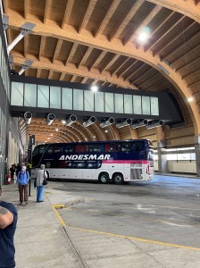 Am dritten Tag zog ich wie beabsichtigt weiter nach Santiago de Chile. Hoch auf dem Berg auf fast 3000 Meter Höhe, mitten in einem chilenischen Skigebiet ist der Zollübergang. In zwei riesigen hohen Abfertigungshallen, funkelnagelneu hingestellt, mit Platz für etwa 15 grosse Autobusse werden wir abgefertigt. Bemerkenswert an dieser Stelle ist das Prozedere mit den Covid-Dokumenten. Der Busunternehmer hat schon beim Buchen der Tickets, darauf aufmerksam gemacht, dass die Chilenen explizit die Coviddokumente prüfen. Wir stehen nun also in der Schlange vor einem Tisch wo zwei Frauen in Zivil die Dokumente sehen wollen. Es geht blitzschnell. Die zwei schauen die Dokumente kaum an und geben diese gleich wieder zurück. Viel Lärm um nichts. Ich hätte auch ein Guezli-Rezept hinhalten können und wäre durchgewunken worden.